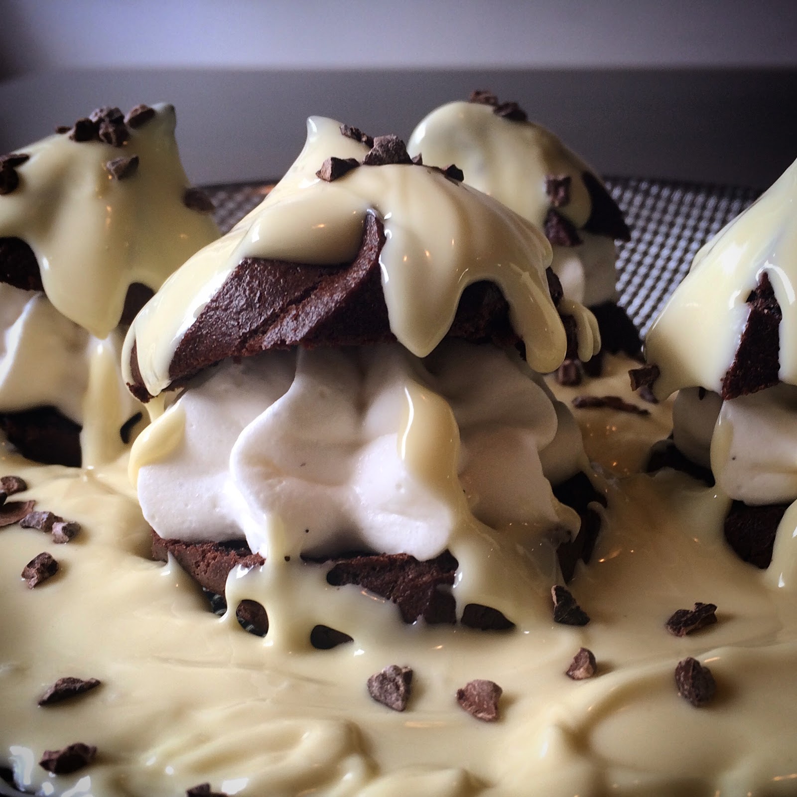 - מסדרים את הפרופיטרולים בצלחת, ושופכים בנדיבות רוטב שוקולד לבן. מפזרים פולי קקאו לקישוט
